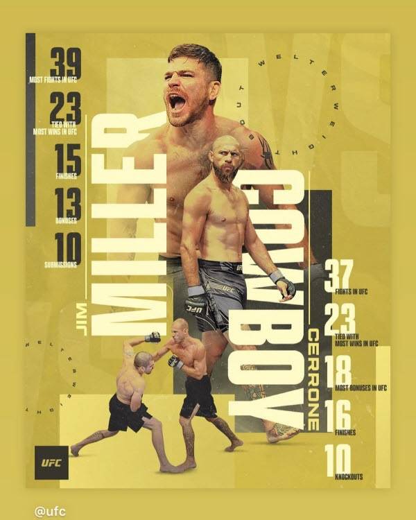 | ▲ 짐 밀러(상단)는 옥타곤 23승 파이터끼리의 맞대결에서 세로니에게 8년 전 패배를 설욕하며 역대 최다승 파이터에 등극했다. |