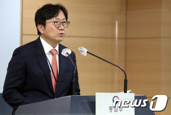 (서울=뉴스1) 김명섭 기자 = 조중훈 통일부 대변인이 4일 서울 종로구 세종대로 정부서울청사에서 7·4남북공동성명 50주년 기념식 행사 관련 등 현안에 대해 정례브리핑을 하고 있다. 2022.7.4/뉴스1