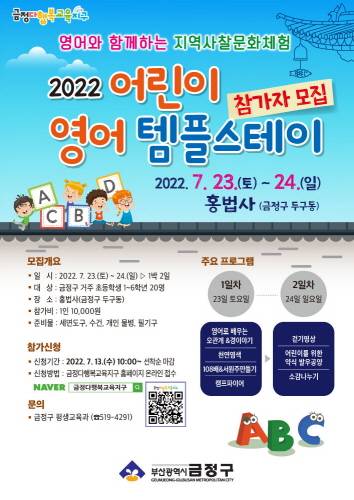 부산 금정구(구청장 김재윤)는 오는 23일과 24일, 1박 2일의 과정으로 관내 초등학생을 대상으로 불교문화 체험을 통해 올바른 정서발달을 지원하고 영어에 대한 관심과 학습 동기를 높이기 위한 영어와 함께하는 지역사찰문화체험 프로그램 '어린이 영어 템플스테이'의 참가자를 모집한다고 밝혔다.