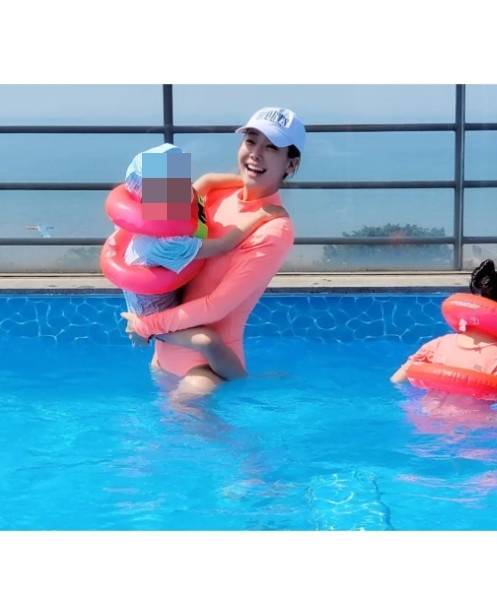 사진 속 소유진은 아이들과 호텔 수영장에서 물놀이를 즐기고 있다. 소유진은 아이들과 비슷한 수영복을 입고 신난 얼굴로 행복함을 만끽하고 있다.