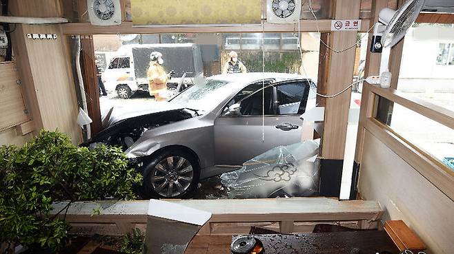 사고 당시 점심시간을 맞아 식당을 찾은 손님 20여 명이 있었지만, 다행히 차량이 식당 외부의 기둥을 받아 인명피해는 없었습니다.