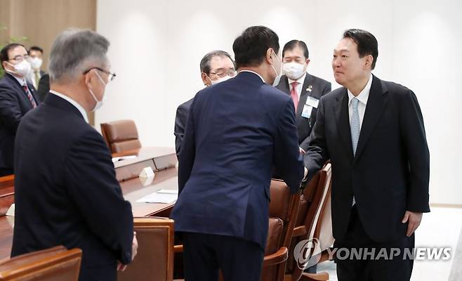 (서울=연합뉴스) 서명곤 기자 = 윤석열 대통령이 4일 오후 서울 용산 대통령실 청사에서 일본의 기업인 단체 게이단렌(經團連·경제단체연합회) 대표단을 접견하고 있다. 2022.7.4 [대통령실통신사진기자단]
