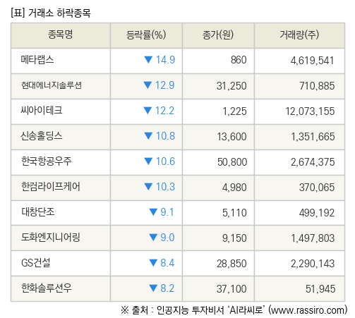 [fnRASSI]장마감, 거래소 하락 종목(메타랩스 -14.9% ↓)