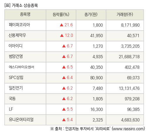 [fnRASSI]장마감, 거래소 상승 종목(페이퍼코리아 21.6% ↑)