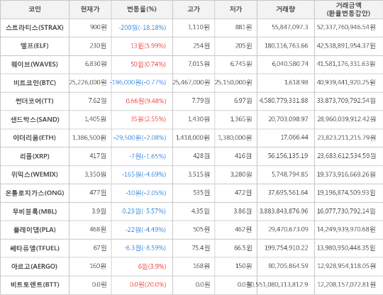 하락세를 보이는 가상화폐는 총 8종목으로 이 중 가장 큰 하락세를 보이는 스트라티스는 전일 대비 -18.18% 하락한 900원에 거래되고 있다.