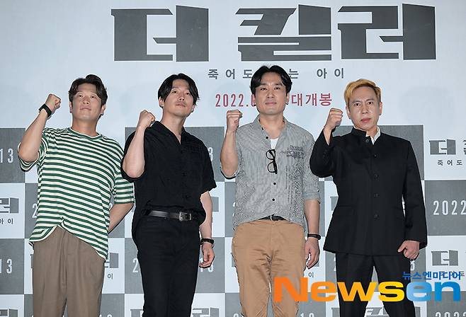 배우 최기섭, 브루스 칸, 장혁, 최재훈 감독이 7월 4일 오후 서울 용산구 용산CGV아이파크몰에서 진행된 영화 '더 킬러: 죽어도 되는 아이'(감독 최재훈) 언론 배급 시사 및 기자간담회에서 포즈를 취하고 있다.