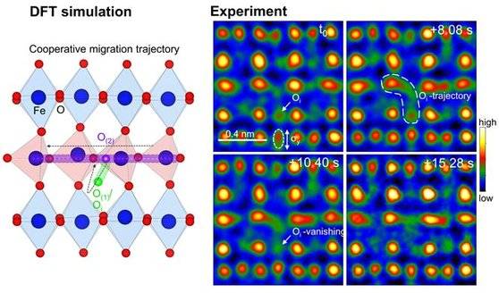 KENTECH의 오상호 교수 연구팀은 수차보정 투과전자현미경을 이용한 실시간 원자분해능 이미징법을 고온(300도)에서 일어나는 SrFeO3-SrFeO2.5 위상 상전이에 적용해 특정 결정 방향으로 산소의 확산이 빠르게 일어나는 확산 채널이 형성되고, 이 채널 내 FeO 원자 배열이 독특한 변화를 거쳐 산소의 확산이 일어나는 것을 관찰했다. 실험으로 관찰한 확산 경로는 원자단위 시뮬레이션을 통해 에너지적으로 안정한 경로임을 확인했다.