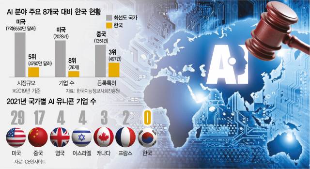 하지만 AI 산업 현황은 이에 미치지 못한다. 미국·중국 등 주요 8개국 간 AI 시장 규모를 보면 한국은 5위로 하위권이다. 여기에 AI 기업 수도 미국이 2028개인 반면 한국은 26개로 꼴찌를 달리고 있다. 또 AI 관련 스타트업에 지난해 81조 원의 자금이 몰리는 등 AI 유니콘(기업가치 1조 원 이상 비상장 기업)이 속속 탄생하고 있지만 국내는 전무하다. 글로벌 시장조사 업체 CB 인사이트에 따르면 지난해 새로 탄생한 글로벌 AI 유니콘은 총 65곳이지만 한국은 단 한 곳도 없다. 법무법인 린의 조사(2019년)에서도 글로벌 누적 투자 상위 100대 스타트업 중 31%는 해당 사업 모델이 한국에서 금지돼 사업을 시작할 수조차 없는 것으로 조사됐다.