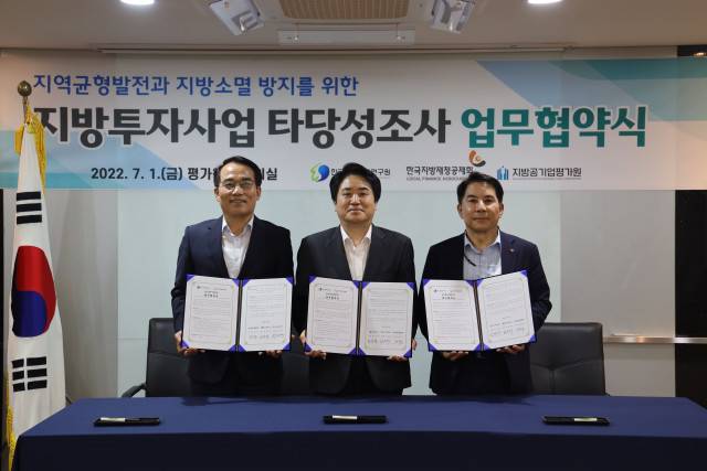 한국지방행정연구원(김일재 원장)은 7월 1일 지방공기업평가원 회의실에서 2개 기관과 ‘지방투자사업 건전성 제고, 지역균형발전과 지방소멸 방지 및 기관의 ESG 경영 확산을 위한 상호협력 업무협약’을 체결했다고 4일 밝혔다.
