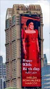 '사치의 여왕'으로 불리는 이멜다(페르디난드 마르코스 필리핀 대통령 모친)의 93세 생일을 맞아 마닐라 도심 빌딩의 대형 전광판에 축하 메시지가 등장(사진)했다.