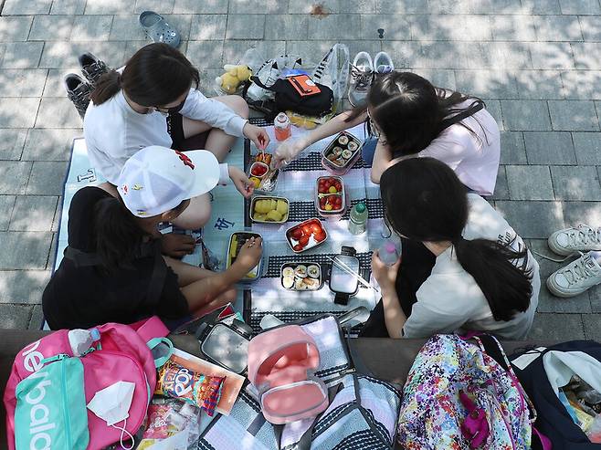 학창시절 가장 즐겁고 행복한 날을 떠올려보자. 친구들과 깔깔거리며 소풍이나 수학여행을 갔을 때가 떠오르지 않나. 서울 용산구 전쟁박물관에서 소풍 나온 초등학생들을 만났다. 가지고 온 음식을 나눠 먹는 모습이 정겹기만 하다. 다양한 종류 과일과, 세월이 흘러도 여전히 주인공인 김밥이 눈에 띈다.