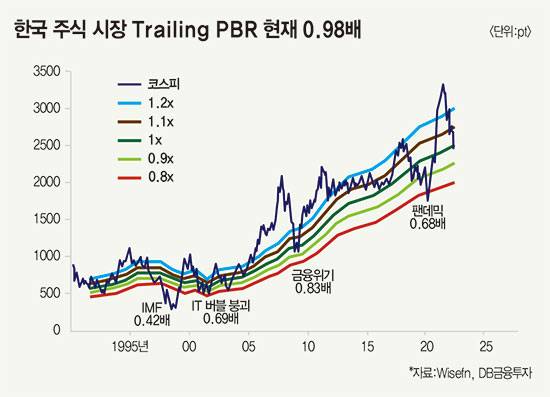 강현기 DB금융투자 애널리스트는 “최근 인플레이션으로 기업 장부가치가 제고된 것과 이런 추세가 현재의 주당순자산가치에 즉각 반영되지 않은 점을 감안하면 한국 주식 시장의 실제 PBR은 지금 기록된 수치보다 더 낮을 가능성이 크다”며 “단기적 변동성이 잔존하더라도 주식 시장 반전 가능성을 고려해야 한다”고 내다봤다.