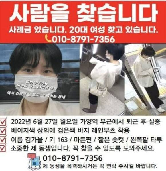 오늘(5일) 경찰에 따르면 서울 강서경찰서 실종수사팀은 지난달 27일 강서구 가양역 인근에서 실종된 김가을(24) 씨를 찾고 있습니다.