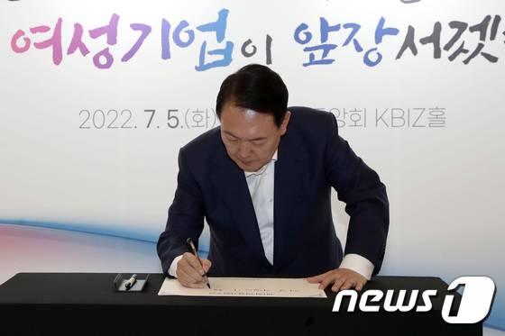 (서울=뉴스1) 안은나 기자 = 윤석열 대통령이 5일 오후 서울 여의도 중소기업중앙회관에서 열린 제1회 여성기업주간 '여성경제인의 날 유공자 정부포상 수여식'에 참석해 방명록을 작성하고 있다. (대통령실사진기자단) 2022.7.5/뉴스1