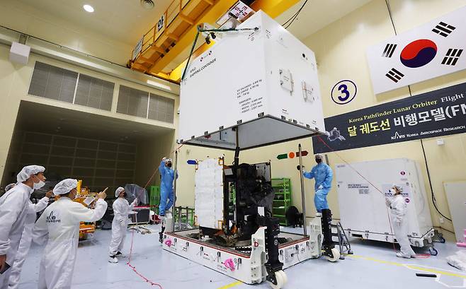 5일 대전 유성구 한국항공우주연구원에서 관계자들이 다누리를 온도·습도·양압 유지 및 충격 흡수가 가능한 특수 컨테이너에 싣고 있다.