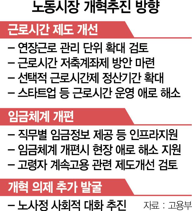 정부는 지난달 임금과 근로시간 제도 중심으로 한 첫 노동시장 개혁 방향을 발표했다. 노동시장 개혁은 이달 출범하는 전문가 집단인 미래노동시장연구회가 구체적인 정책 과제를 만들고 고용부가 세부 과제를 다듬는 방향으로 이뤄진다.
