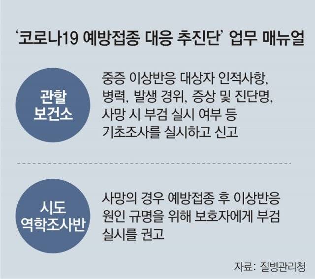 취재진이 확인한 코로나19 예방접종 대응 추진단의 ‘접종 후 이상반응 시도 신속대응팀 업무 매뉴얼’은 또 달랐다. 시도 역학조사반이 보호자에게 부검 실시를 권고하도록 규정돼 있었다.