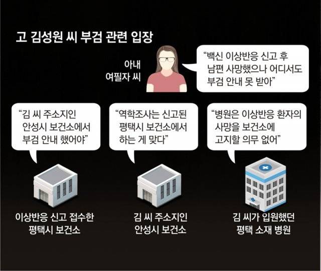 보건소들은 안내 책임을 서로 떠넘겼다. 김 씨의 이상반응 신고를 접수한 평택시 보건소 관계자는 5일 동아일보 기자와의 통화에서 “김 씨의 주소지는 안성시이므로 부검 안내는 안성시 보건소에서 해야 한다”고 주장했다. 반면 안성시 보건소 관계자는 “역학조사는 입원 병원 관할 보건소에서 이뤄진다”며 평택시 보건소에 책임을 넘겼다.