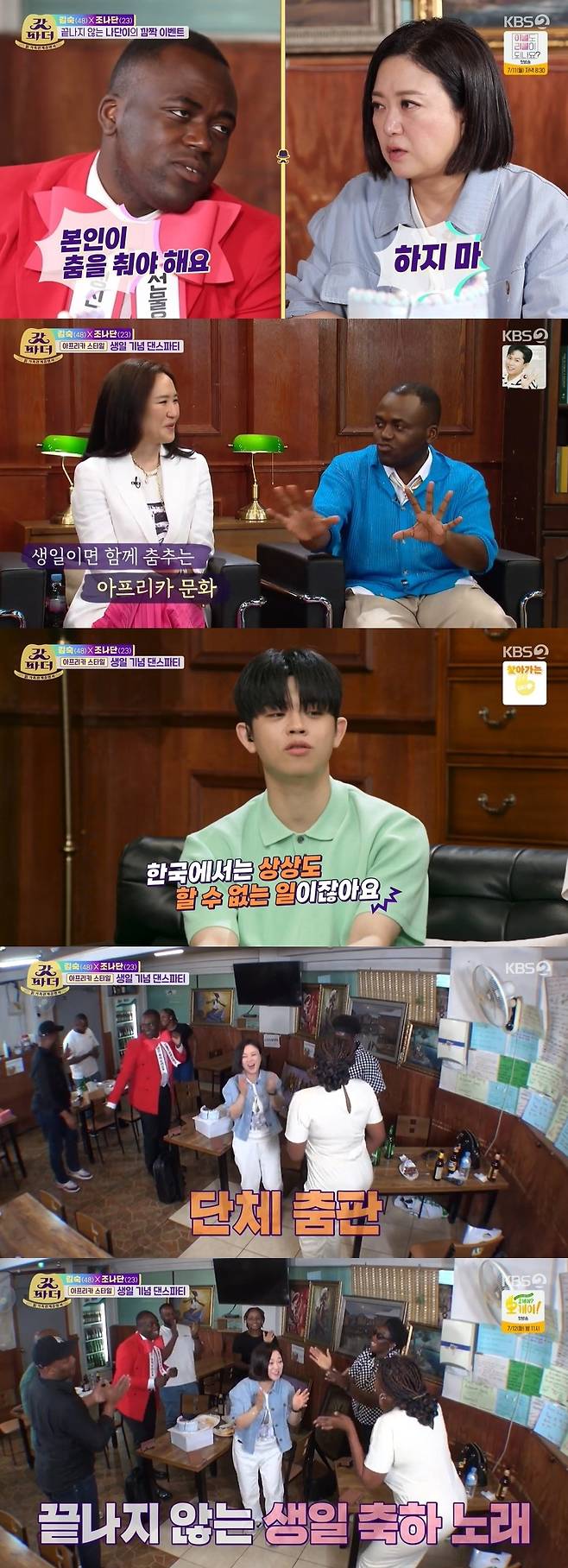 이어 조나단은 "아프리카 문화권에 오지 않았나. 생일 당사자가 춤을 춰야 한다"라며 아프리카 스타일의 생일파티를 제안했다. 춤을 추기 시작하면 모두가 함께 출 것이라고 설명했지만, 한국에서 식당에서 갑자기 춤을 춘다는 것은 상상할 수 없는 일이었다.