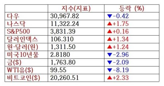 이날 뉴욕증권거래소(NYSE)에서 스탠더드앤드푸어스(S&P)500지수는 전일 대비 6.06포인트(0.16%) 오른 3831.39로 마감했다. 나스닥종합지수는 전일 대비 194.39포인트(1.75%) 뛴 1만1322.24로 장을 마쳤다. 반면 다우존스산업평균지수는 전장 대비 129.44포인트(0.42%) 내린 3만967.82로 거래를 마쳤다.