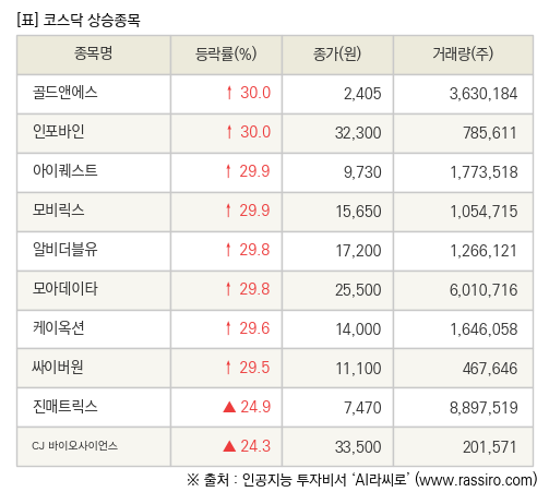 [fnRASSI]장마감, 코스닥 상승 종목(골드앤에스 30.0% ↑)