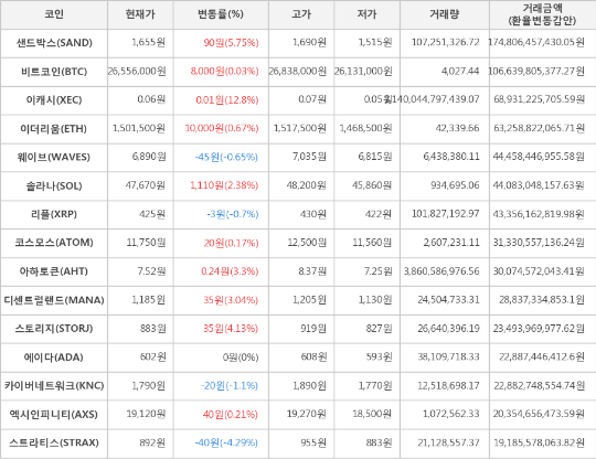 또한, 샌드박스(5.75%, 1,655원), 스토리지(4.13%, 883원), 아하토큰(3.3%, 7.52원), 디센트럴랜드(3.04%, 1,185원), 솔라나(2.38%, 47,670원), 이더리움(0.67%, 1,501,500원), 엑시인피니티(0.21%, 19,120원), 코스모스(0.17%, 11,750원)가 상승세를 나타냈다.