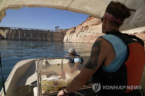 FILE - Utah State University master's student Barrett Friesen steers a boat near Glen Canyon dam on Lake Powell on June 7, 2022, in Page, Ariz. Confirming their worst fears for record-low lake levels, National Park Service fisheries biologists have discovered that smallmouth bass, a non-native predator fish, has made its way through the dam and appear to have spawned in the lower Colorado River, where it can prey on humpback chub, an ancient native fish they have been working to reestablish. (AP Photo/Brittany Peterson, File)