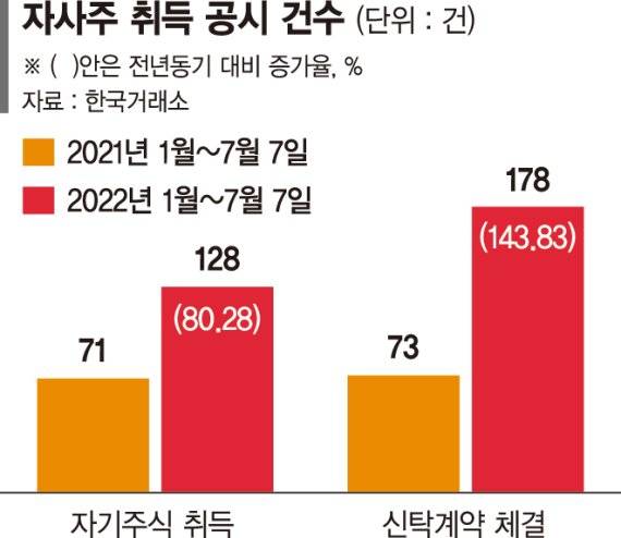 7일 한국거래소에 따르면 올해 1월 1일부터 이날까지 거래소에 신고된 자기주식 취득 건수는 총 128건으로 집계됐다. 이는 지난해 같은기간 71건에 비해 57건(80.2%)나 급증한 수준이다. 올해 신탁계약 체결 건수도 178건으로 전년 동기 73건의 두배 이상 증가했다. 자사주를 직접 취득하거나 위탁 매입하겠다는 의지를 밝힌 기업이 300개가 넘는 것이다.