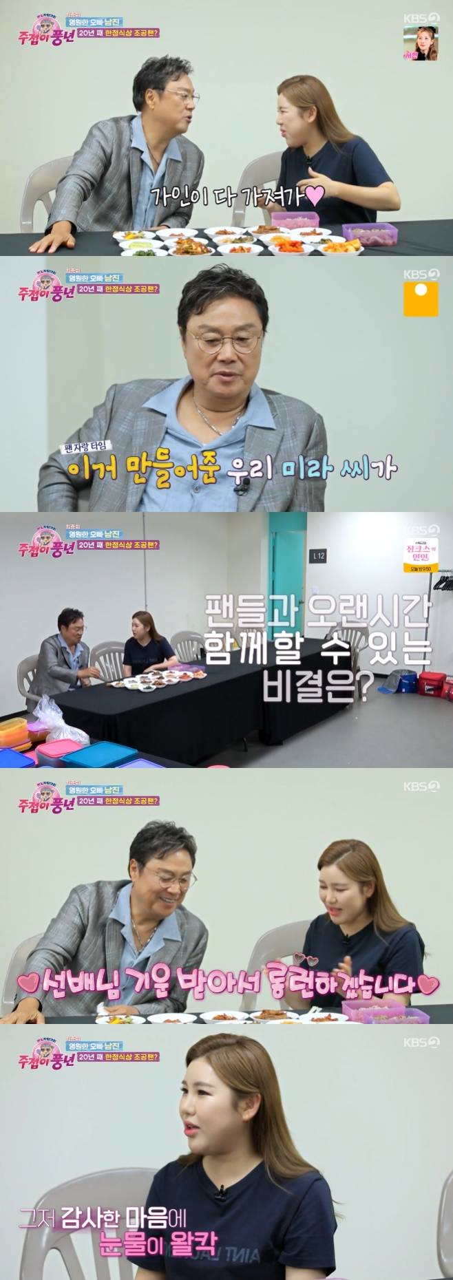 음식을 어느 정도 먹은 송가인은 선배 가수 남진에게 "팬들과 이렇게 오랜 시간 함께할 수 있는 비결이 뭐냐"라고 질문했다. 남진이 "그건 복이라고 본다"라고 말하자, 송가인은 "전 이제 팬들과 함께한 지 3년 밖에 안 되지 않았냐"라고 말했고 남진은 "30년 금방 간다. 나도 데뷔가 엊그제 같은데 벌써 60년이 지났다. 팬들에게 늘 고맙다"라고 해 웃음을 자아냈다.