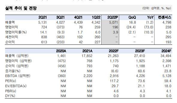 박 연구원은 “소형전지(원통형전지 등) 매출액은 2조1000억원으로 테슬라 상해공장 셧다운에도 불구하고 전분기대비 12.6% 늘어난 것으로 추정된다”며 “영업이익률은 생산원가 상승분의 고객사 전가 타이밍(생산 다음 분기 판가에 반영)이슈로 전분기대비 3.2%포인트 하락한 9.3%를 기록한 것으로 보인다”고 밝혔다,