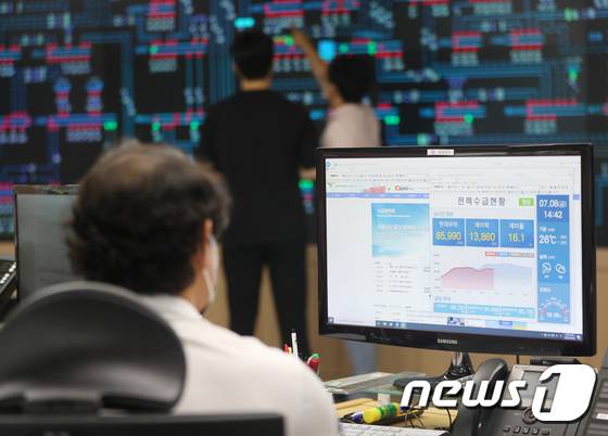 (수원=뉴스1) 김영운 기자 = 예년보다 이른 무더위가 이어지면서 지난 7일 최대 전력수요가 역대 최고치를 기록한 가운데 8일 오후 경기 수원시 영통구 한국전력공사 경기지역본부 전력관리처 계통운영센터에서 관계자들이 전력수급상황을 점검하고 있다. 2022.7.8/뉴스1
