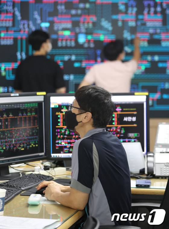 (수원=뉴스1) 김영운 기자 = 예년보다 이른 무더위가 이어지면서 지난 7일 최대 전력수요가 역대 최고치를 기록한 가운데 8일 오후 경기 수원시 영통구 한국전력공사 경기지역본부 전력관리처 계통운영센터에서 관계자들이 전력수급상황을 점검하고 있다. 2022.7.8/뉴스1