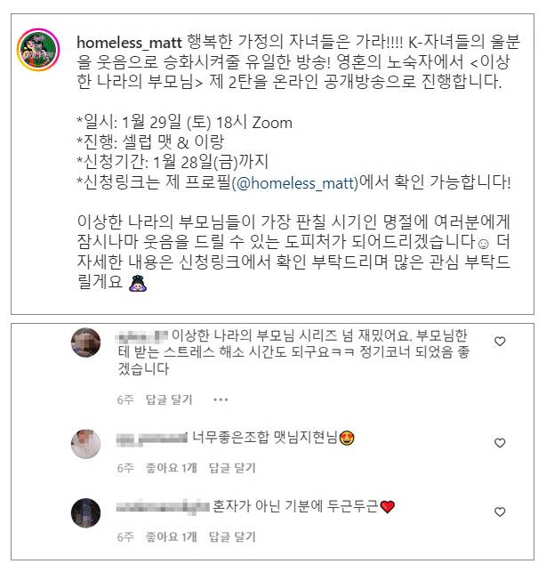 <영혼의 노숙자>는 2017년 방송을 시작한 코미디 팟캐스트로, ‘셀럽 맷’이 진행한다. 월평균 조회 수가 100만에 이르는 인기 팟캐스트이다. 여러 특집 중 ‘이상한 나라의 부모님’(이하 ‘이나부’)이라는 기획은 뜨거운 반응을 얻으며 지금까지 총 3탄이 나왔다. 말 그대로 ‘이상한 부모’ 밑에서 성장한 자식들이 부모를 제보하는 것이다. 자식이? 부모를?! 부모님 욕이야 사춘기 시절부터 친구들끼리 누려온 콘텐츠지만, 이것을 공식적인 장으로 끌어내는 것은 유교 사회에서 상당한 도발로 보인다. 부모는 늘 ‘무자식이 상팔자’, ‘가지 많은 나무에 바람 잘 날 없다’, ‘매를 아끼면 자식을 망친다’며 온갖 푸념을 하고, 육아 상담 프로그램에 제보도 하지만 자식에게는… 영 마이크가 오지 않았다. 패륜이거나, ‘그래도 가족인데’, 제 얼굴에 침 뱉기라는 반응이 부담스럽기 때문이다. 이나부는 이 딜레마를 유쾌하게 돌파한다. 이나부 1탄의 소개 글은 다음과 같다. “도대체 우리 부모님은 왜 이럴까? 늘 생각하셨던 분들께 이번 화를 바칩니다. 걱정 마세요. 남들 부모님도 만만찮게 이상하답니다!(싱긋).” 그리고 유머의 끈을 강력하게 견인하는 것은 진행자인 셀럽 맷의 태도이다.