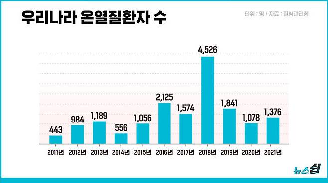 일찍 폭염이 찾아오면서 전국 곳곳에서 온열질환자가 속출하고 있다. 온열질환 추정 사망자는 올해에만 벌써 6명이다. 질병관리청은 지난 2011년부터 매년 여름 전국 500여 개 응급실 운영 의료 기관에 방문하는 온열질환 발생 현황을 신고 받아 모니터링하는 '온열질환 응급실 감시체계'를 운영하고 있다. 이에 따르면(8일 기준) 지난 5월 20일부터 지난 7일까지 653명의 온열 질환 환자와 6명의 사망자가 발생했다. 지난해 같은 기간 온열질환자는 165명, 추정 사망자는 3명이었다. 환자 수는 전년 대비 4배, 사망자 수는 2배 늘어났다.