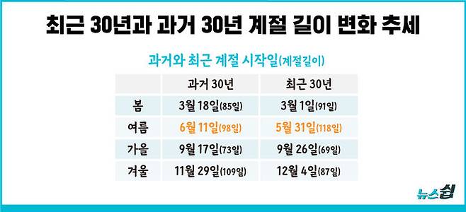 계절 길이도 변화했다. 과거 30년 대비 최근 30년 간 여름은 20일 길어지고, 겨울은 22일 짧아졌다. 봄과 여름 시작 일이 각각 17일, 11일 빨라졌다. 최근 30년 간 여름은 118일, 약 4개월로 가장 길었다. 가을은 69일로 가장 짧았다. 봄 가을 옷을 사면 몇 번 입기도 전에 계절이 바뀐 것 같은 건 기분 탓 만은 아니었다.