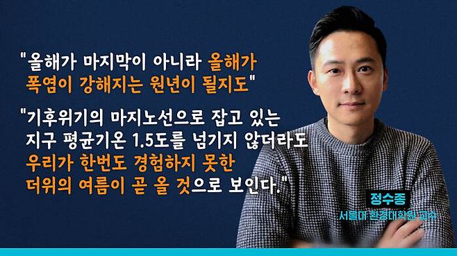 서울대 환경대학원 정수종 교수는 올해가 폭염이 강해지는 원년이 될 수 있다고 경고했다. "지난해 IPCC 6차 보고서의 미래 전망을 보면 '폭염은 강해진다'고 나오며 기후 위기의 마지노선으로 잡고 있는 지구 평균기온 1.5°C를 넘기지 않더라도 지금 우리가 한번도 경험하지 못한 더위의 여름이 곧 올 것으로 전망된다. 이제는 피할 수 없다는 뜻이다." 정 교수는 "지난 20 년 간 기후를 연구하면서 사실이 아니었으면 하는 예측이 사실로 확인되는 과정을 경험했다며 앞으로 우리가 맞이할 미래가 우리의 예측일 가능성이 매우 높다"고 경고했다. 이제는 유럽이나 미국, 중국에서 등에서만 폭염이나 대홍수가 나타나는 것이 아니고, 올해 당장 우리나라에서 이러한 현상이 발생한다 해도 전혀 이상할 것이 없다. 기후 위기는 더 이상 먼 미래의 이야기도, 배부른 이야기가 아니라 생존의 문제가 되고 있다.