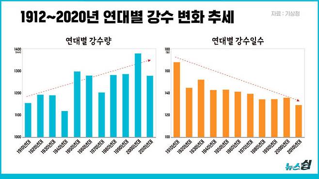 강수량은 늘어난 데 비해 강수 일수는 줄었다. 그만큼 강수의 강도가 강해졌다는 말이다. 최근 30년 간 강수량은 연간 135.4mm 증가했지만, 비가 오는 날은 21.2일 줄었다. 109년 간 연 강수량은 10년마다 17.71mm씩 증가했다. 특히 여름철 강수량이 크게 증가했고, 강수 강도는 여름과 가을에 증가했다.