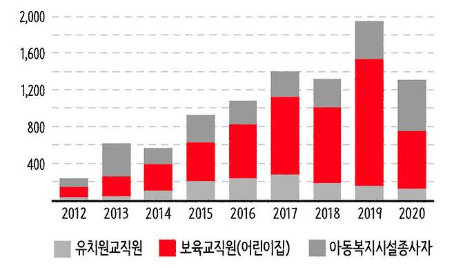 보건복지부의 <학대피해아동보호현황> 자료입니다. 아동 복지시설에서 일하는 사람이 아동학대를 한 경우는 얼마나 되는지 그래프로 그려봤어요. 그래프를 보면 알 수 있듯이 2015년 어린이집 CCTV 설치 의무화 이후에도 보육교직원에 의한 아동학대 건수는 줄지 않았습니다. 2015년 427건에서 2019년 1,384건으로 3배 이상 증가했죠. CCTV 설치 이전엔 보이지 않았던 아동학대가 포함되어 늘어난 것도 있겠지만, 설치 의무화가 5년 넘게 지났어도 숫자가 줄지 않은 건 그 영향만으로 보긴 어렵죠.