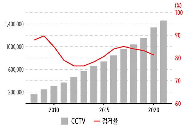 공공기관에 설치된 CCTV 대수도 늘어나고 있고, 다른 나라와 비교해서도 빽빽한 정도가 낮지 않은데... 이렇게 CCTV 설치가 늘어난 이유는 대부분이 공공 치안과 범죄 예방을 위해서입니다. 그렇다면 과거에 비해 공공의 치안은 나아졌을까요? 아까 위에서 그렸던 연도별 공공 CCTV 현황 그래프에다가 선 그래프를 얹어봤습니다. 선 그래프가 나타내는 건 범죄 검거율입니다. CCTV의 설치가 늘어난 만큼 검거율도 올라가야 맞을 것 같은데, 실제 데이터는 그렇지 않아요. 오히려 2008년과 비교해보면 2020년 검거율은 더 떨어졌으니까요. 그렇다면 CCTV는 범죄 예방에 효과가 있는 걸까요?