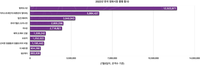 영화관이 정상화된 올해, 여러분은 어떤 영화를 보러 가셨습니까? 스트리밍 서비스의 등장과 영화 관람 습관의 변화로 사회적 거리두기가 풀리더라도 다시 나오기 힘들 거라던 ‘천만영화’가 뜻밖에 금방 다시 나타났습니다. 물론 “범죄도시2”의 흥행 돌풍은 반짝효과 내지 반사효과일 수도 있어서 '천만영화'의 출현이 극장의 완전한 부활인지는 아직은 지켜봐야 한다는 신중론이 우세합니다. 그래도 올해 들어 지금까지 극장을 찾은 관객이 약 4천8백만 명에 이르니 국민 한 명이 한 편 꼴로 본 셈입니다. 코로나가 대유행했던 2020년과 2021년의 한 해 관객이 약 6천만 명에 머물렀기 때문에 회복세인 것만큼은 분명합니다.