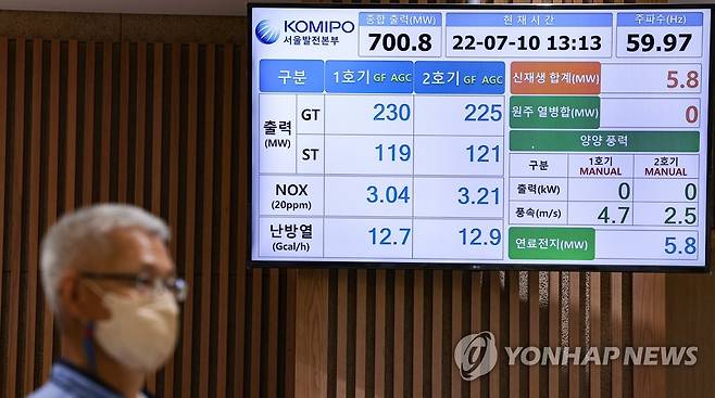 (서울=연합뉴스) 황광모 기자 = 폭염으로 전력 수급에 대해 비상이 걸린 10일 오후 서울 마포구 한국중부발전 서울발전본부 중앙제어실의 모니터에 이 발전소의 가동 상황이 표시돼 있다. 2022.7.10