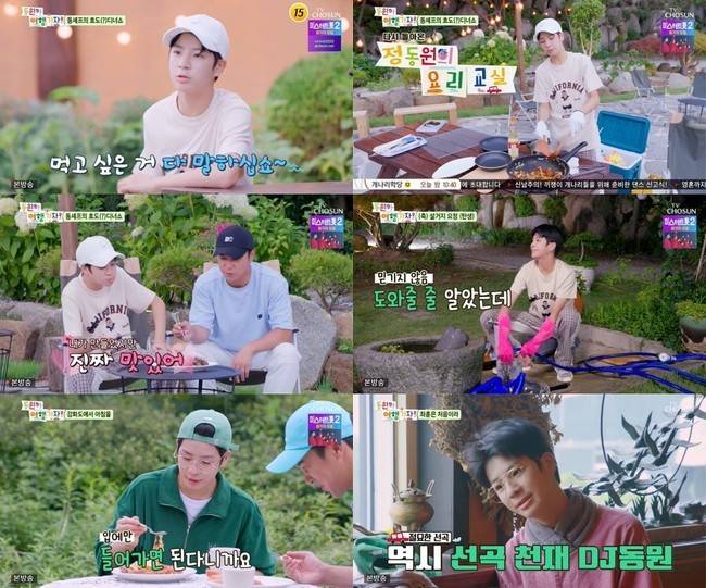 또한 정동원은 마시멜로 구이, 콘치즈로 코스 요리를 선보이며 침샘을 자극하는 먹방을 펼쳤다. 식사를 마친 장민호는 정동원이 약속한 소원으로 뒷정리와 설거지를 말했다. 정동원은 투덜거리면서도 홀로 뒷정리와 설거지까지 마쳐 장민호의 웃음을 자아냈다.