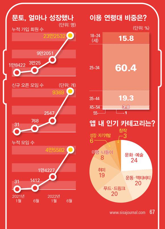 이렇게 취향을 드러내 가며 모이는 사람이 늘어나고 있다. 대표적인 관심사 기반 커뮤니티 문토의 사례를 보자. 문토는 코로나19를 거치면서 300배 성장했다. 2021년 1월 앱 론칭 당시 31개 모임으로 시작한 문토는 2022년 6월 9300개 신규 모임을 오픈했다. 1만8000명이었던 가입 회원 수는 23만 명으로 늘어났다. 서비스를 이용하는 연령층은 주로 MZ세대다. 전체 활성 사용자 중 60%가 25~34세 연령층이다. 취미 여가를 중심으로 모임을 구성하는 프립의 경우 누적 회원이 120만 명에 달하는데, 이 중 MZ세대 이용자가 92%에 육박한다.