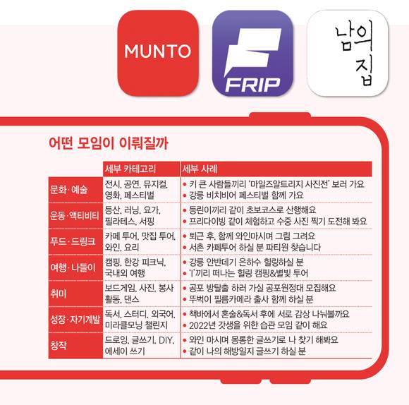 1인 가구가 늘어나고 있는 사회적 변화에 더해, 재택근무와 유연근무가 일상화됐다. 코로나19를 거치는 동안 일상에서 겪는 '관계의 결핍'은 늘어났고, 개인이 겪는 외로움의 크기도 커졌다. 내가 뭘 좋아하는지, 어떤 삶을 꾸려 가고 싶은지에 대해 스스로 질문을 던지는 사람들이 생겨났다. '마이싸이더(mysider·나를 중심으로 하는 사람)'라는 신조어가 그 경향을 대변한다. 인맥의 부재에 갈증을 느낀 MZ세대는 자신의 취향을 투영할 수 있는 모임과 그 모임을 함께 할 수 있는 사람들을 플랫폼을 통해 찾기 시작했다. 오프라인 모임에도 적극적이었던 이들은 플랫폼을 기반으로 새로운 모임을 구성하는 것에도 거부감이 없다. 의무감과 소속감을 부담스러워하는 이 세대에게 짧은 시간 동안 취향에 따라 모임을 꾸릴 수 있는 관심사 기반 커뮤니티의 장점이 부각됐음은 물론이다. 함께 모여 생각을 나누거나 활동을 함께 할 수 있는 카테고리가 인기다. 문토 앱 내 인기 카테고리는 문화예술(24%)과 운동·액티비티(20%), 푸드·드링크(20%) 순이다. 취미, 여행, 자기계발, 창작 카테고리가 그 뒤를 잇는다.