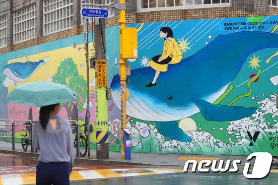 (서울=뉴스1) 민경석 기자 = 13일 서울 성동구 성수동 카페거리에 ENA 드라마 '이상한 변호사 우영우(우영우)'와 KT의 20대 전용 브랜드 'Y'와 협업해 탄생한 벽화가 그려져 있다.