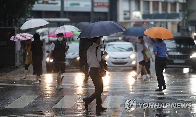 (서울=연합뉴스) 김인철 기자 = 13일 오후 서울시청 앞에 장맛비가 내리고 있다. 2022.7.13