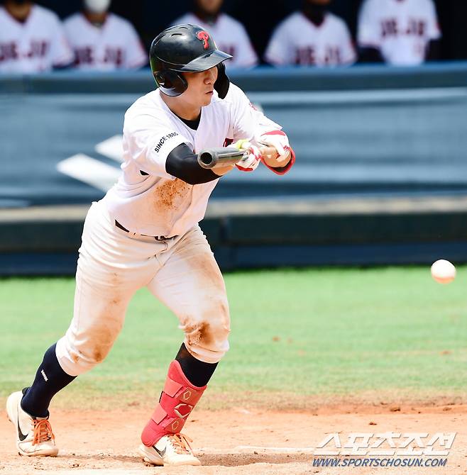 제77회 청룡기 전국고교야구선수권 대회 배재고와 제주고의 경기가 14일 서울 목동야구장에서 열렸다. 배재고 안겸이 3회초 무사 1루에서 희생번트를 대고 진력질주 하고 있다. 목동=최문영 기자 deer@sportschosun.com/2022.07.14/