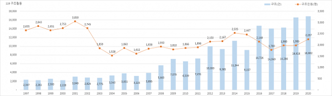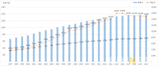 의료기관도 매년 증가 추세로 지난 1997년 666개소이던 병원은 2020년 1382개소로 2배가 늘었고, 병상수도 3656개에서 1만 4943개로 5배 가까이 증가했다.