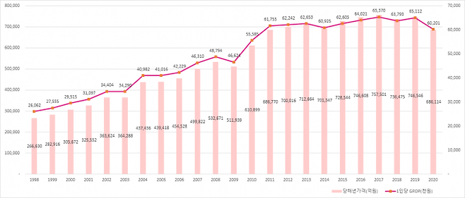 산업수도 울산의 지역내총생산(GRDP)은 지난 1998년 26조 6630억원에서 2020년에는 68조 6114억원(전국의 3.5%)으로 2.6배 증가했다. 1인당 지역내총생산도 지난 1998년 2606만원에서 2020년 6020만원으로 2.3배 증가해 25년 동안 지속적으로 전국 1위를 이어오고 있다.