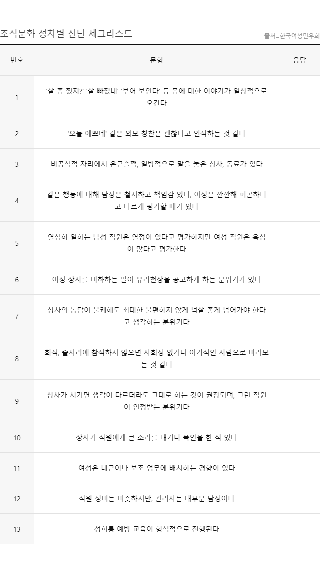 제도적 노력과 캠페인을 벌이고 있지만, 실효성이 없는 것 같다고요. 그렇다면 먼저 조직 내 성별 고정관념부터 점검해보는 건 어떨까요. 부지불식간에 성차별적 행위를 조장하는 조직 내 편견을 직시하는 것에서부터, 성평등에 대한 현실 진단이 가능할 것입니다. 아래 체크리스트를 통해 '우리 회사는 얼마나 성차별적인지' 한번 확인해볼까요.